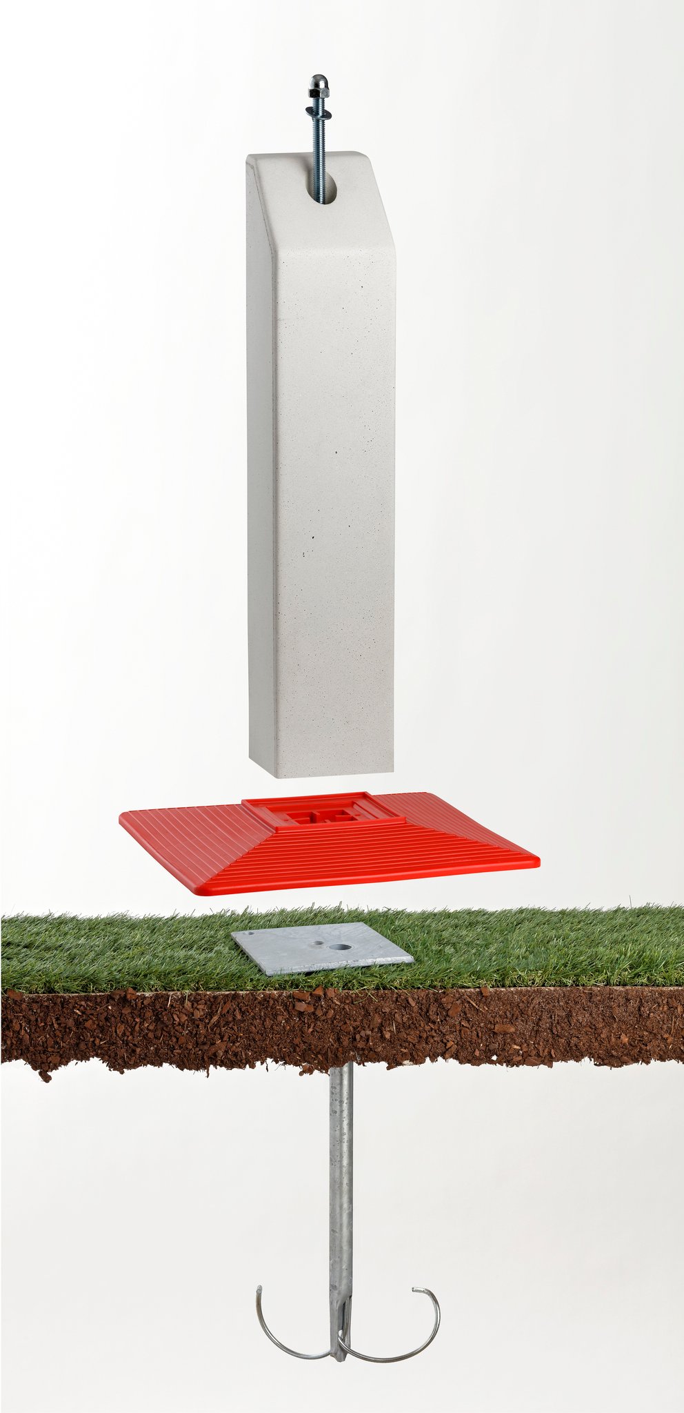 Borne composée d’une tête, d’une plaque de stabilité, d’un ancrage centré BTF , d’une plaque inox clip anti-retour telluclip noyée dans la résine et d’un bouchon d’étanchéité Ø26 mm.